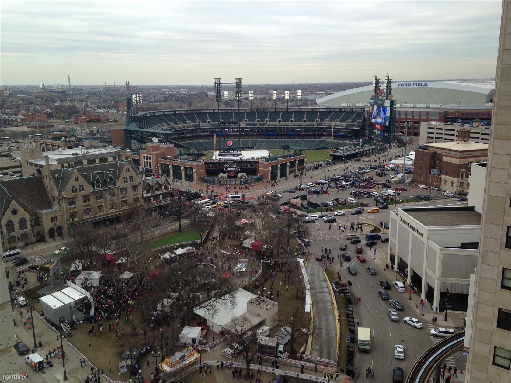 Our suite is on the 14th floor with a Grand Circus Park, Comerica Park, and Woodward view. Like all of our suites, it is fully furnished and includes every detail. Just bring your suitcase, You don't need to bring anything, Just show up and get ready for work, a night on the town or watch you favorite show on the HDTV. There will even be a can opener and corkscrew waiting for you to put to good use. Every detail... Oh, and the utilities, cable TV, Comcast WiFi, and parking are all included.
